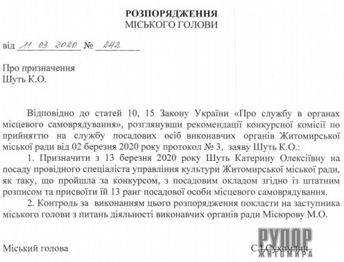 Житомирський міський голова Сергій Сухомлин своїм розпорядженням №242 від 11 березня 2020 року наказав призначити Катерину Шуть на посаду провідного спеціаліста управління культури міської ради.