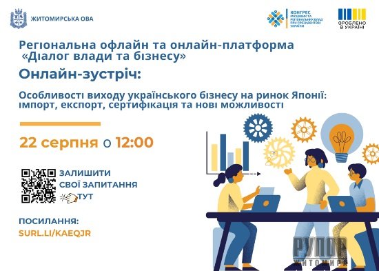 22 серпня о 12:00 у рамках проєкту «Діалог влади та бізнесу» відбудеться чергове засідання на тему: «Особливості виходу українського бізнесу на ринок Японії: