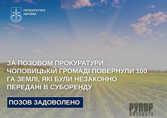 За позовом прокуратури Чоповицькій громаді повернули 100 га землі, які були незаконно передані в суборенду