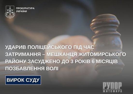 Ударив поліцейського під час затримання – мешканця Житомирського району засуджено до 3 років 6 місяців позбавлення волі
