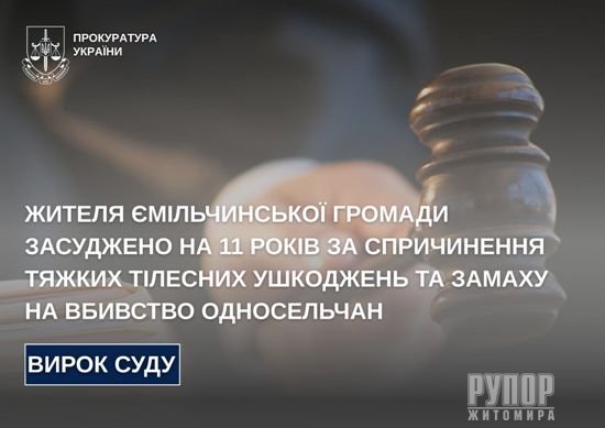 Жителя Ємільчинської громади засуджено на 11 років за спричинення тяжких тілесних ушкоджень та замаху на вбивство односельчан