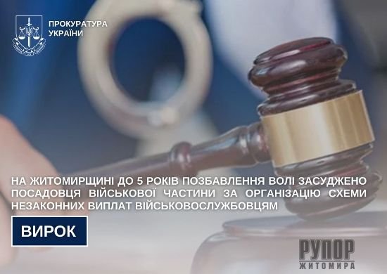 На Житомирщині до 5 років позбавлення волі засуджено посадовця військової частини за організацію схеми незаконних виплат військовослужбовцям