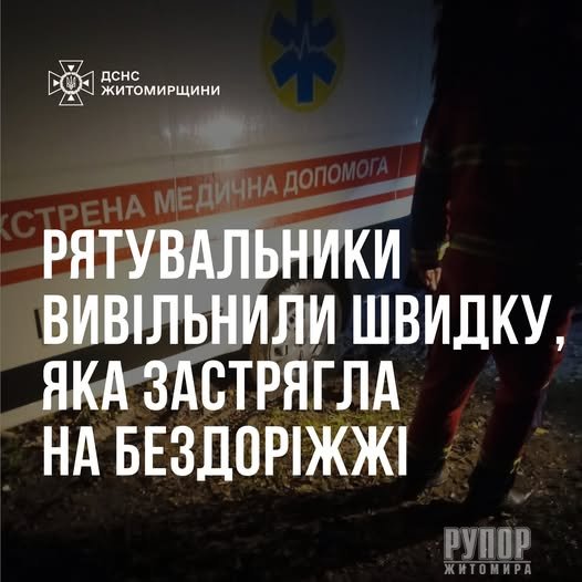 Учора пізно ввечері в селищі Романів Житомирського району рятувальники допомогли працівникам екстреної медичної допомоги, автомобіль яких застряг