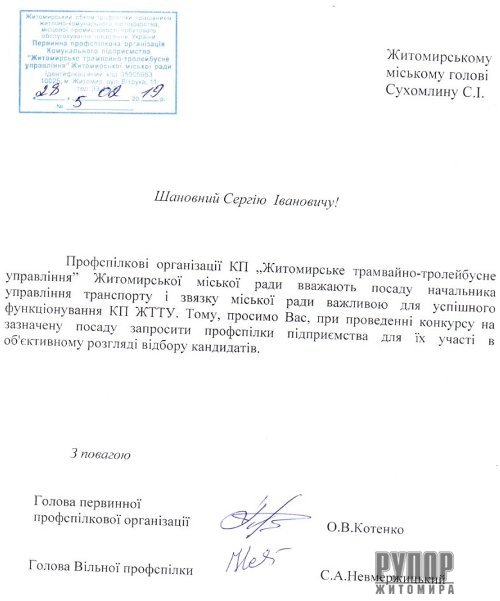 Представники профспілкових комітетів комунального підприємства "Житомирське трамвайно-тролейбусне управління" звернулися до міського голови Сергія Сухомлина з проханням дати можливість профспілкам бути присутніми на конкурсі по заміщенню вакантної посади начальника управління транспорту та зв'язку Житомирської міської ради.