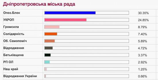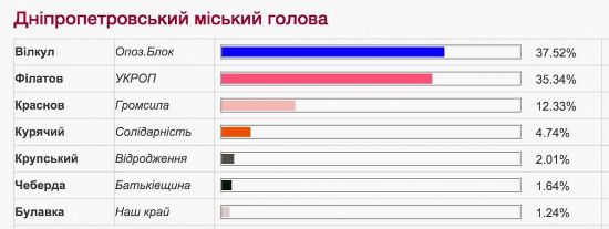 По данным подсчета протоколов с мокрыми печатями о результатах голосования на выборах мэра Днепропетровска победу в первом туре одержал Александр Вилкул – за него проголосовали 37,5%. Борис Филатов отстал, набрав 35,3%. Разрыв составил более 7 тысяч голосов. На выборах в Днепропетровский горсовет победил "Оппозиционный блок" – 30,3% (обработано 99% протоколов). На выборах в областной совет также победил "Оппозиционный блок" - 34 % (обработано 90% протоколов).