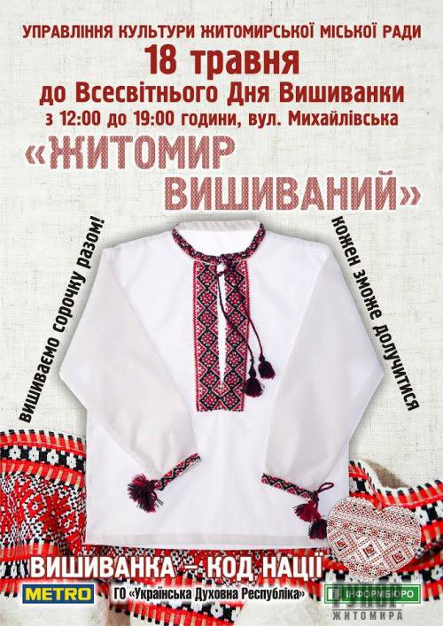 До всеукраїнського святкування Дня вишиванки 18 травня з 12:00 на вулиці Михайлівській розпочнеться великий захід – «Житомир вишиваний»У програмі Дня вишиванки:* юні майстри і майстрині Житомира представлять свої роботи по конструюванню та моделюванню одягу в національному стилі. Житомирські красуні зможуть продефілювати у стильному одязі; * бажаючі зможуть долучитися до вишивання великої сорочки – зробити свій внесок власноруч; * уроки вишивання хрестиком або гладдю та майстер-клас зі стародавніх способів з ткацтва; перегляд документального сучасного українського фільму «Спадок нації» про українську вишивку. В рамках культурного обміну на Михайлівській відбудеться презентація національно – культурних товариств Житомира. По завершенню свята, о 19:00, на Соборній площі розпочнеться «Вишивана хода». Дівчата, які проявлять фантазію і прийдуть у креативному національному вбранні, зможуть проїхатися на байках! Учасники ходи цього року отримають приємні сюрпризи. Які саме – приходьте у вишиванці і дізнаєтеся. Запрошуємо усіх житомирян та гостей міста, приходьте, буде цікаво і весело!