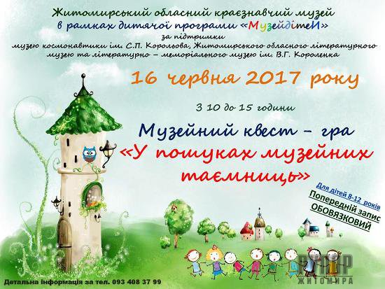 Комунальний заклад обласної ради «Житомирський обласний краєзнавчий музей», музей космонавтики ім. С.П.Корольова, Житомирський обласний літературний музей та літературно-меморіальний музей ім. В.Г. Короленка запрошують дітей стати учасниками міжмузейного квесту. За умовами гри, юні дослідники повинні відвідати усі чотири музеї за відповідною схемою. Старт квесту – у Житомирському краєзнавчому музеї, де кожен учасник отримає буклет-бланк із завданнями. Аби знайти відповіді, діти мають детально ознайомитися з експозиціями музеїв. Для участі у квесті, який відбудеться 16 червня з 10.00 до 15.00, запрошуються діти від 8 до 12 років у супроводі одного з батьків. Переможцями стануть ті, хто нададуть правильні відповіді, розгадають зашифроване послання та подолають дистанцію якнайшвидше. На переможців чекають нагороди - справжній оптичний мікроскоп, набір для експериментів та квиток до кінотеатру, а також, для кожного учасника – заохочувальний приз. Зареєструватися та більш детально дізнатися про квест можна за тел. 093-408-37-99. Прес-служба обласної ради