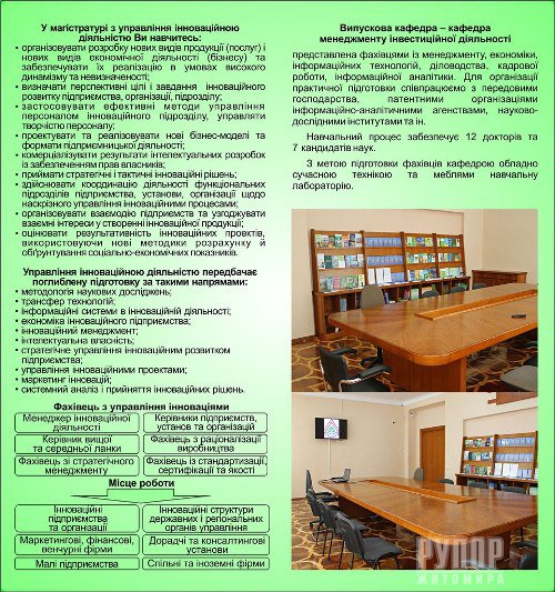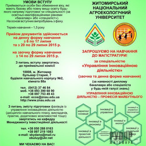 З 6 липня 2015 року в Житомирському національному агроекологічному університеті починається прийом документів на навчання до магістратури за унікальною спеціальністю - "Управління інноваційною діяльністю".