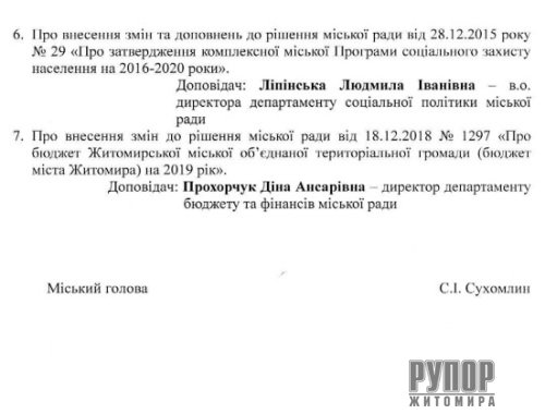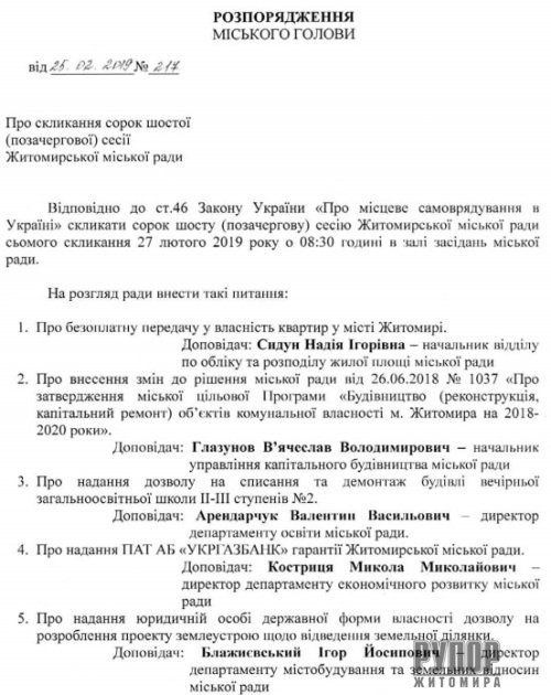 Сорок шоста (позачергова) сесія Житомирської міської ради відбудеться 27 лютого о 08:30