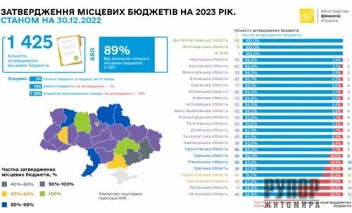 Як повідомляє Міністерство Фінансів України, станом на 30 грудня в Україні затверджено 89% місцевих бюджетів. Трійку лідерів очолили Житомирська та Дніпропетровська області, а також м.Київ. Зокрема, затверджено: 24 обласні бюджети та бюджет міста Києва; 104 районних бюджети (не затверджено – 15); 1286 бюджетів територіальних громад (не затверджено – 152). Для повноцінного функціонування закладів бюджетної сфери, безперервного надання ними послуг споживачам, органам місцевого самоврядування необхідно пришвидшити процес затвердження місцевих бюджетів та подати інформацію до Мінфіну за допомогою інформаційно-аналітичної системи «LOGICA».