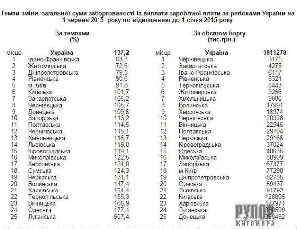 Житомирська область – друга в Україні за темпами виплати заборгованості із заробітної плати. Такі дані станом на 01 червня 2015 року, – повідомляє департамент праці та соціального захисту населення. Зокрема, порівняно із загальнодержавним показником боргу з виплати заробітної плати (137%), наша область скоротила заборгованість до 72,6% й опинилася в лідерах – друга після Івано-Франківщини, де показник боргу становить 63,3%. Крім того, Житомирщина скоротила загальний обсяг боргу із виплати заробітної плати до 9266 тис.грн. і зайняла за цим показником 6 місце в Україні.