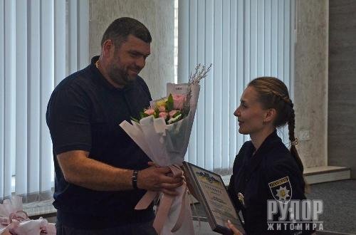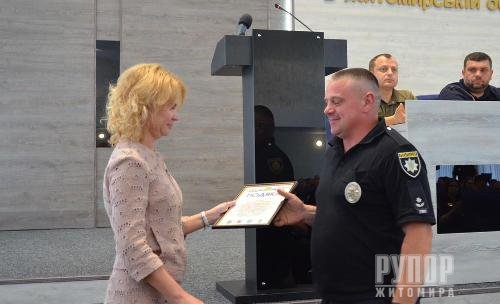 4 липня, у День Національної поліції України, у Головному управлінні НП в Житомирській області вартових правопорядку привітали з професійним святом. Заступники начальника обласної військової адміністрації та голови обласної ради, керівники правоохоронних органів регіону та міської ради висловили вдячність поліцейським за їх службу для безпеки людей. Начальник ГУНП Житомирщини Олег Трачук, звертаючись до присутніх, сказав: – Кожному з вас у цей день хочу подякувати за вірність Присязі і Україні. Ваша щоденна буденна служба сьогодні, як ніколи, вселяє у людей віру та надію на стабільність і безпеку, правопорядок і законність. Впевненість, тверда переконаність, чіткі дії, - усі ці складові вашої діяльності нині дуже потрібні жителям Житомирщини та й усієї України. Відзнаки, Грамоти та Подяки МВС, НПУ та Головного управління вручив кращим поліцейським керівник поліції Житомирщини за сумлінне виконання службових обов’язків і вірність Присязі та Україні. Заохочувальними нагородами поліцейських відзначили Житомирські обласні військова адміністрація та облрада. Також Подяки зі словами вдячності за ефективну взаємодію та співпрацю озвучили заступник Житомирського міського голови Сергій Кондратюк, начальник Управління Служби безпеки України в області Сергій Лисак, прокурор Житомирської області Олександр Білошицький, командир військової частини 3047 Національної гвардії України Олексій Мельник, заступник начальника 9 прикордонного загону ім. Січових стрільців Юрій Кособуцький.