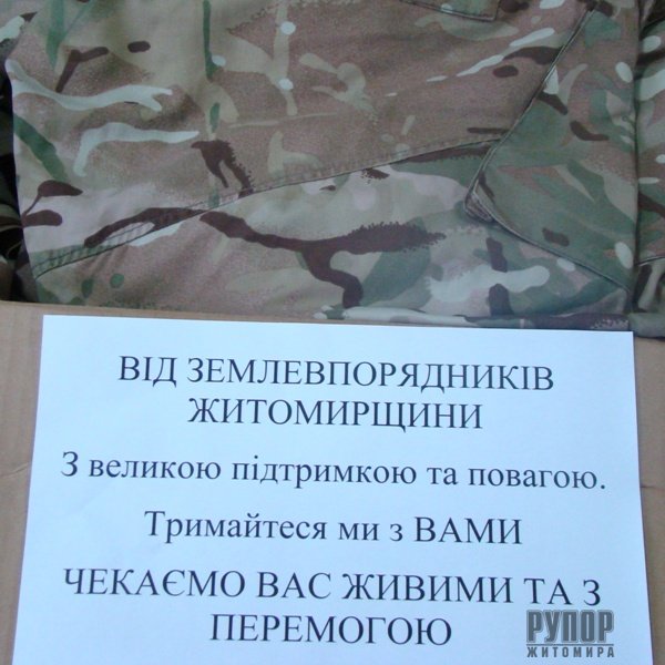 З тиждень більше 18 тисяч гривень для військових на Сході було зібрано працівниками Головного управління Держземагентства у Житомирській області, його територіальними підрозділами у районах та містах. Близько 12 тисяч гривень витрачено на закупівлю продуктів харчування та товарів першої необхідності. Ще 6 тисяч гривень – на придбання військової форми. 2 липня 2014 року всі усе придбане було передано на Коростишів, а вже з Коростишева на Схід країни, а саме – гору Карачун. Також окремо надалися кошти на пальне для автомобіля, який має ще раз відправитися на Схід. До загального збирання коштів військовим долучилася також землевпорядні організації, що функціонують на території області, зокрема: ФОП Петренко П.П.; ФОП Ткач О.Ю.; ПП "Андваг"; ПП "Геозем"; ТОВ "Житомирземлепроект"; ДП "Житомирський науково-дослідницький та проектний інститут землеустрою"; ТОВ "Геоприват"; ПП "Геодезгруп».  Нагадаємо, що на Житомирщині тепер військовослужбовцям в межах чинного законодавства позачергово безкоштовно видаватимуть земельні ділянки під будівництво. Це рішення було прийняте минулого місяця. Тому нині землевпорядниками проводиться роз'яснювальна робота з членами сімей загиблих та поранених про можливість отримання у власність земельних ділянок сільськогосподарського призначення по місцю їх проживання. Рідні та близькі загиблих звертаються до землевпорядників та виявляють бажання отримати у власність земельні ділянки. Чимало з них вже отримали відповідні документи для виготовлення проектної документації. Крім того, на прохання начальника Головного управління Максима Бугайчука, землевпорядні роботи по оформленню земельних ділянок розробники документації із землеустрою (ліцензіати) виконують безкоштовно. Робота по наданню можливої допомоги рідним та близьким загиблих та пораненим в ході проведення АТО не припиняється. «У такий складний час особливо важливо підтримувати наших воїнів, які чесно виконують свій обов’язок та захищають територіальну цілісність України, - вважає Максим Бугайчук, - тому ми буде далі підтримувати, допомагати, аби віддячити їх за проявлену мужність та патріотизм. Ніхто не має права залишатися осторонь. Робімо добрі справи - все повертається!». Прес-служба Головного управління Держземагентства у Житомирській області