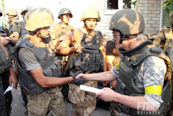 Черговий візит до військовослужбовців, які виконують бойові завдання в зоні АТО здійснив народний депутат України, Голова Комітету Верховної ради з питань національної безпеки і оборони Володимир Литвин. Більше 100 комплектів обмундирування, 30 сучасних бронежилетів, 40 кевларових шоломів, питна вода, продукти харчування та особистої гігієни було загружено на БТРи та доставлено до своїх земляків - військовослужбовців, які несуть бойову вахту на Донеччині. На завершення своєї зустрічі Володимир Литвин нагородив військовослужбовців цінними подарунками – наручними годинниками та побажав щоб стрілки на циферблаті якнайскоріше наближали ту мить, коли вони, живі та здорові, повернуться в обійми своїх дітей, дружин та батьків.