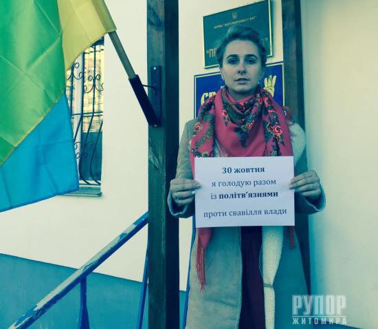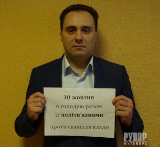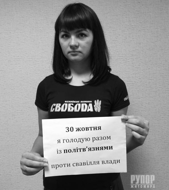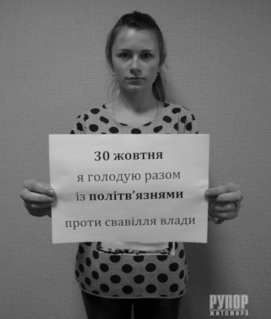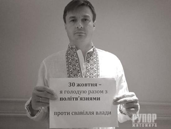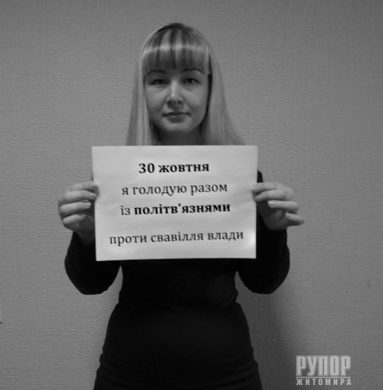 30 жовтня 2015 року відзначають День політв’язня, впроваджений В’ячеславом Чорноволом та Василем Стусом. У цей день ще з радянських часів політичні в’язні відмовлялися від їжі на знак протесту, боротьби за свої права й нескореності. Житомирські свободівці ініціюють флешмоб у підтримку сучасних політв’язнів. До акції долучився голова Житомирської обласної організації ВО «Свобода», правозахисник Сидір Кізін: «Підтримую своїх підзахисних та близько сотні інших свободівців, добровольців, волонтерів та патріотів, ув'язнених на другому році нинішнього режиму. Вимагаємо негайного звільнення політв'язнів!». Сидiр КiзiнЮрiй КоцюбаIрина ПродащукВалентина КоваликМарiя БовсуновськаНадiя ОмелянчукТетяна ГолiкПрес-служба Житомирської обласної організації ВО «Свобода»