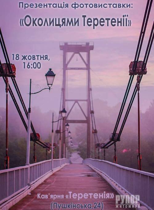 Презентація, зустріч з автором 18 жовтня 16:00. Місце: кав’ярня-кондитерська “Теретенія” (вул. Пушкінська, 24, будівля Водонапірної вежі). Світанковий Житомир, тумани над долинами Тетерева, захід сонця, який огортає околиці міста, осіння павутинка в парку та вражаюче небо над багатоповерхівками житомирян… І це все зібрано в одній неймовірні виставці тонкого спостерігача та фотографа Ярослава Хоркінса. 18 жовтня в кав’ярні-кондитерській “Теретенія” відбудеться відкриття світлин “Околицями Теретенії”. Назва не є випадковою, адже на картах 16 століття річку Тетерів позначали саме як Теретенія, що з грецької перекладається “протерта крізь скелі”. Поринути в мандрівку околицями Тетерева та пірнути у світ неочікуваного погляду на здавалось би такий знайомий Житомиром - стане відкриттям для кожного відвідувача. На гостей очікує екскурсія незвичними локаціями Житомира від Ярослава Хоркінса, розмова про туристичні принади нашого міста та кавова атмосфера. Початок презентації о 16:00. Вхід вільний. Виставка буде розміщена в кав’ярні-кондитерській “Теретенія” впродовж місяця.