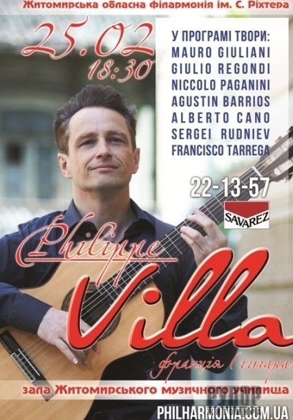 До Житомира приїде відомий французький гітарист, лауреат Міжнародного фестивалю молодих виконавців в Бордо (1991), конкурсу Міжнародного фонду Єгуді Менугіна (1992) – Філіп Вілла. Він вважається одним з найяскравіших гітаристів свого покоління, невтомним експериментатором та спеціалістом з романтичного репертуару. Філіп Вілла - стрімкий як буревій та безпосередній як дитина. Коли він грає на гітарі, то здається, що він грає не тільки руками, але й усім тілом, навіть обличчям. Він навчався грі на класичній гітарі в Бето Давезака, Юрія Жирмаля та Хосе Томаса. «Я хотів би опинитися в часи бароко. Інколи мені здається, що я народився не в той час – довкола війни, голод, агресія. Композитори пишуть те, що відчувають, можна сказати, що вони є свого роду лакмусовими папірцями свого часу. Щодо мене – то я безумовний романтик і з цим нічого не поробиш.» Концерт відбудеться 25 лютого, о 18:30, у залі Музичного училища.