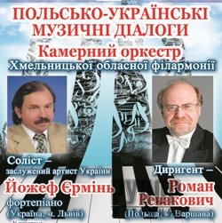 Концертна програма «Польсько-українські діалоги» спрямована на ознайомлення слухачів з вершинними творами сучасної академічної музики України та Польщі. Будуть виконані твори Гражини Бацевич, Валентина Сильвестрова, Генрика Миколая Гурецького, Ігора Щербакова, Мирослава Скорика та Воцеха Кіляра. Камерний оркестр Хмельницької обласної філармонії був створений у вересні 1992 року. Важливим досягненням колективу стала його участь у Всеукраїнському конкурсі камерних оркестрів «Прем'єр-оркестр 2009». Колектив не одноразово виступав на престижних мистецьких форумах та фестивалях: «Київ музік-фест» (м. Київ), «Контрасти» (м. Львів), «Два дні і дві ночі» (м. Одеса)