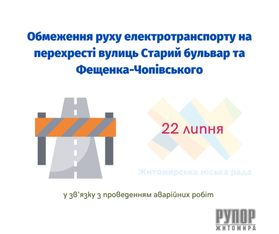 За інформацією КП «Житомирводоканал», сьогодні буде обмежено рух електротранспорту на перехресті вулиць Старий бульвар та Фещенка-Чопівського.