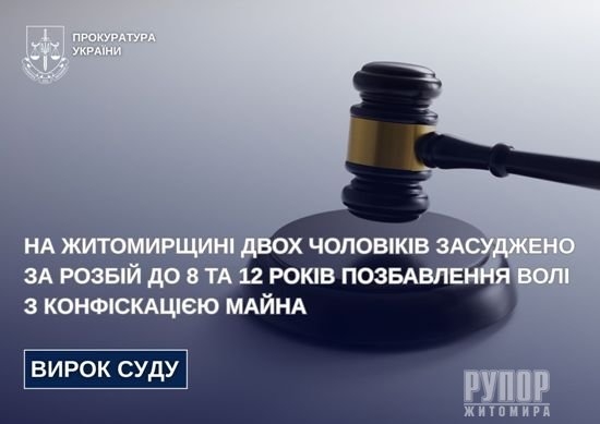 На Житомирщині двох чоловіків засуджено за розбій до 8 та 12 років позбавлення волі з конфіскацією майна