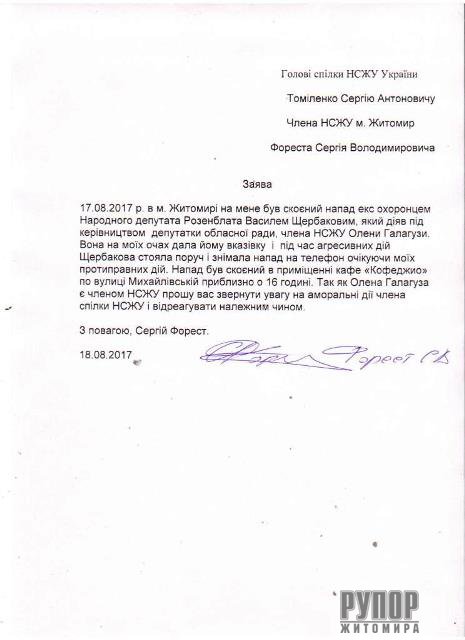 Житомирський журналіст Сергій Форест звернувся до Національної спілки журналістів України стосовно конфлікту, який відбувся в одній із кав’ярень Житомира. «17 августа в центре Житомира около 16 часов на улице Михайловская в кафе «Кофеджио» при выполнении редакционного задания газеты «20хв» неожиданно на меня набросился с бранью бывший охранник народного депутата Б. Розенблата Василий Щербаков. С ним рядом находилась депутат областного совета «Самопоміч» Елена Галагуза, которая, видел это четко, дала ему указание, после чего начались агрессивные действия Щербакова», - коментує Сергій Форест.