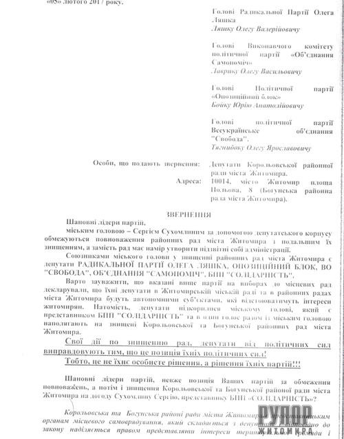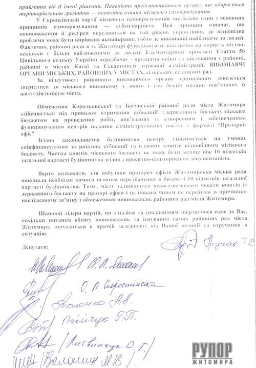 Шановні лідери партій, ми з надією та сподіванням звертаємося саме до Вас, оскільки питання обсягу повноважень та існування самих районних рад міста Житомира знаходиться в прямій залежності від Вашої позиції та втручання в ситуацію».