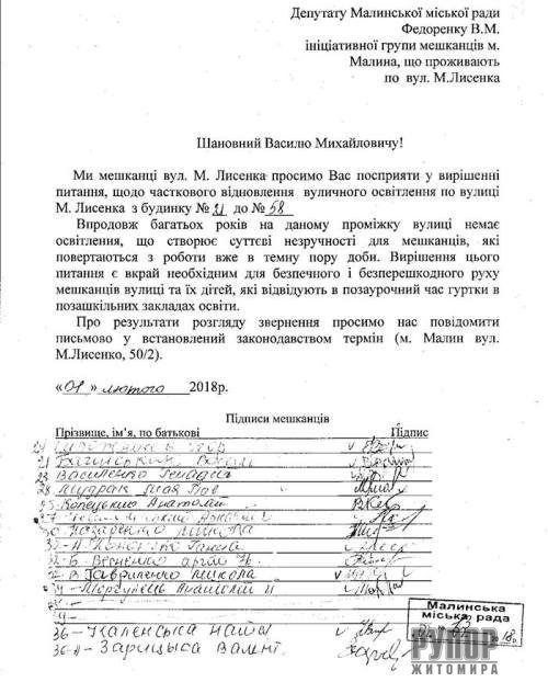 На Житомирщині депутат Малинської міської ради, голова фракції УКРОПу Василь Федоренко звернувся до міського голови Олексія Шостака щодо невідкладного встановлення освітлення на кількох міських вулицях. До укропівця звернулися мешканці вулиці Лисенка, нарікаючи на відсутність ліхтарів біля їхніх помешкань. Депутат вже неодноразово порушував це питання на сесіях міськради, пропонуючи вирішити проблему таким чином, щоб не витрачати додаткових бюджетних коштів. Зокрема, використовувати для освітлення вулиць на околицях міста, вцілілі, працюючі лампочки які у центрі міста міняють на сучасні світлодіодні. «Забезпечити світло на околицях міста – цілком можливо. Просто треба заощадливо до цього ставитися. Щоб старі лампочки не було розтягнуто, розбито, викинуто, щоб підійшли до цієї ситуації по-господарському. Можна навіть на зекономлені кошти протягнути мережу на ті вулиці, де до цих пір її не було. Наприклад, на вулиці Якіра ніколи взагалі не горіли ліхтарі. Саме на цій вулиці з початку поточного року пограбували 3 будинки. Відсутність освітлення, впевнений, цьому сприяло. До того ж батьки бояться за дітей, яким доводиться повертатися з гуртків додому в темряві. Я вже не кажу про небезпеку травматизму. Тож міська влада має взятися за вирішення цього питання. Освітлений має бути не тільки центр Малина!» ‒ зауважив Василь Федоренко. Тож, укропівець наполягає на встановленні щонайменше 28 ліхтарів на найбільш проблемних вулицях: Кузьми Скрябіна, Якіра, Пляжної, Лисенка, Козацької, Енергетиків. На цих вулицях мешкає понад 2 тисячі малинчан.