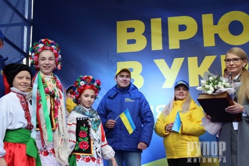 Під час зустрічі з громадою міста Коростеня для Юлії Тимошенко вручила ікону Алла Мельник - військовослужбовець 81-ої десантно-штурмової бригади, яка служила на фронті операційною медсестрою, а матір загиблого під Луганськом воїна АТО Любов Олександрівна Шленчак подарувала політику поліський рушник. Так коростенська громада благословила політика на її святу боротьбу проти злочинної влади, яка довела до зубожіння власний народ, нещадно грабуючи та знищуючи українців.