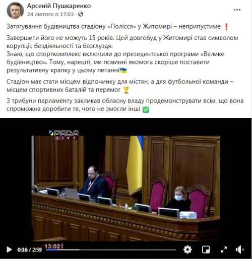 Нардеп Арсеній Пушкаренко вимагає якнайшвидше добудувати стадіон «Полісся» у Житомирі