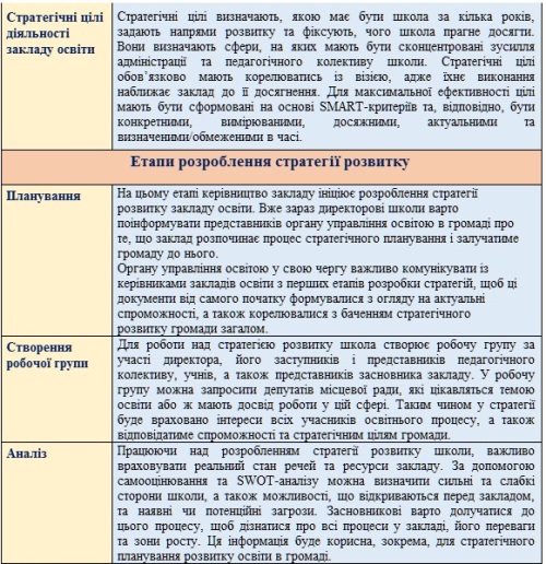 Працюючи над розробленням Стратегії розвитку закладу освіти, вкрай важливо враховувати реальний стан речей та ресурси закладу. Самооцінювання діяльності та управлінських процесів, інструменти для аналізу допоможуть керівникові визначити переваги та недоліки, сильні та слабкі сторони роботи школи, а також можливості, що відкриваються перед закладом, наявні чи потенційні загрози.