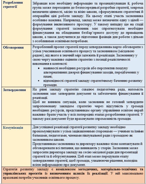 Стратегія розвитку закладу — це також важливий дороговказ для засновника: які точки розвитку є в школі, на що заклад потребує ресурсів, які напрями роботи школи потрібно посилити засновникові. Стратегія розвитку є не тільки важливим концептуальним документом діяльності закладу освіти, а й підґрунтям для розроблення Стратегії розвитку громади в цілому.