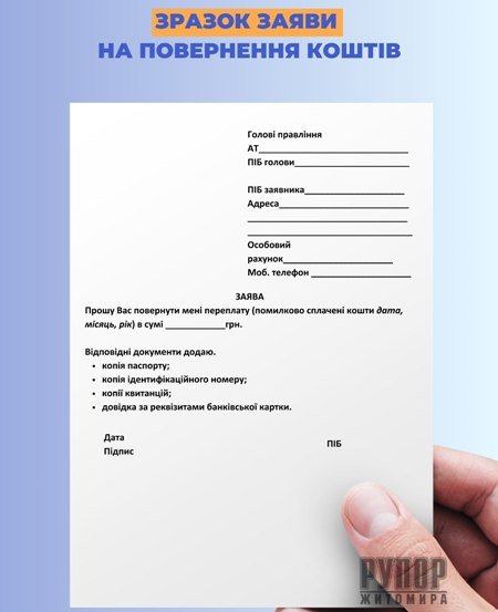 Якщо на особовому рахунку споживача за результатами остаточного розрахунку з попереднім ліцензіатом (АТ «Житомиргаз») обліковується переплата, необхідно підготувати пакет документів і звернутися з ним до найближчого Центру обслуговування клієнтів або надіслати поштою: