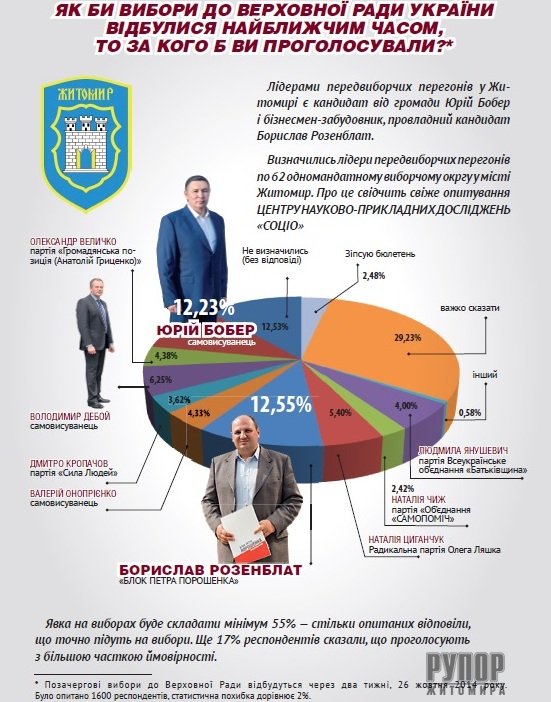 Це підтвердило проведене 8-9 жовтня центром науково-практичних досліджень «Соціо» опитування населення Житомира. Всього за багатоступеневою методикою було опитано 1600 респондентів, що мешкають в Богунському і Королівському районах міста. Статистична похибка, так зване подвійне стандартне відхилення, при рівності позицій може скласти 2,0 відсотка.