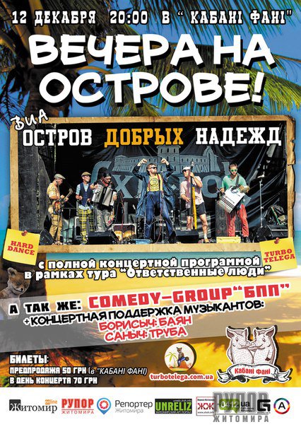 С приходом зимы всегда хочется тепла и праздника, именно по этому мы предлагаем провести приятно вечер вместе с группой ВИА "Остров Добрых Надежд". 12 декабре вновь в Житомире по-настоящему беспроигрышная концертная программа, в рамках тура "Ответственные люди". Пройдет творческий вечер в небезизвестном элитном заведении "Кабани Фани" начало 20:00.