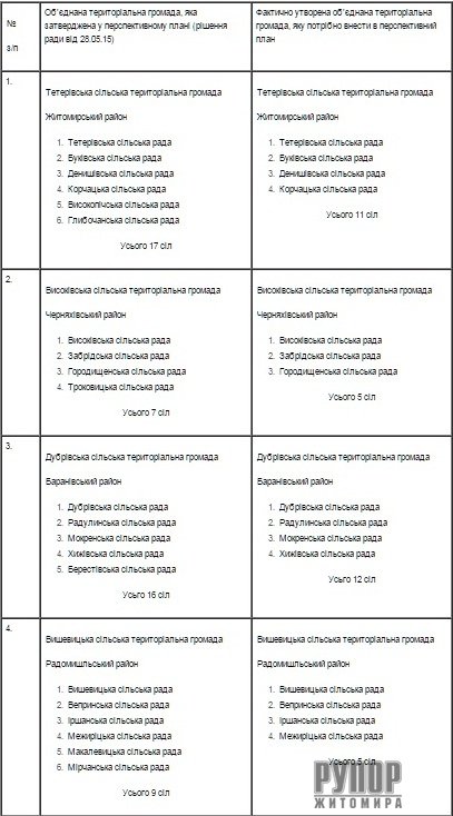 Необхідність прийняття такого рішення викликане розбіжностями у кількості сільських рад, яка зазначена у перспективному плані та фактично увійшла до складу об’єднаних територіальних громад. Наприклад, у перспективному плані, затвердженому обласною радою 28 травня цього року та поданому до Кабінету Міністрів України, у складі Тетерівської сільської територіальної громади передбачалося 6 сільських рад і 17 сіл. Фактично ж до складу громади увійшли 4 сільські ради та 11 сіл. Нижче подаємо додаток до рішення. Порівняльна таблиця Обласна державна адміністрація має подати рішення обласної ради з додатком для затвердження в установленому порядку до Кабінету Міністрів України. Контроль за виконанням рішення покладено на першого заступника голови обласної ради Володимира Ширму. Прес-служба обласної ради