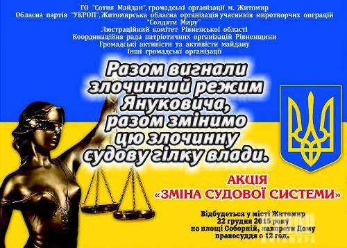 22 грудня о 12.00 годині у м. Житомирі на площі Соборній (біля дому правосуддя) відбудеться акція «Зміна судової системи», яку організовують громадські активісти. Усіх небайдужих житомирян закликають долучитися.