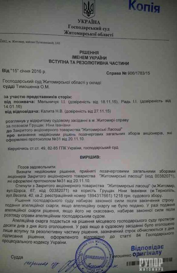 Рішенням від 15.01.2016 року Господарський суд Житомирської області визнав недійсними рішення загальних зборів акціонерів ЗАТ “Житомирські ласощі” 20.11.2010 року, до яких І. Бойко з його прихвоснями не допустили мажоритарного акціонера - компанію Delta Capital SA. Саме на цих зборах у 2010 році було прийняте незаконне рішення про злиття ЗАТ “Житомирські ласощі” із товариством з обмеженою відповідальністю - “мильною бульбашкою”, та розпочалося оформлення рейдерського захоплення підприємства І. Бойком. Прес-служба ЗАТ «Житомирські ласощі»