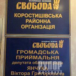 Адреса громадської приймальні: м. Коростишів, вул. Горького, 2 (офіс районної організації ВО "Свобода").