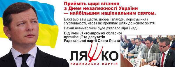 Радикальна партія Олега Ляшка вітає житомирян з Днем Незалежності України