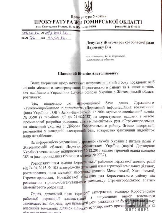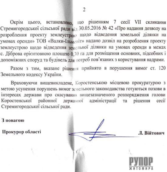 Прокуратура Житомирської області скасувала розпорядження голови Коростенської районної державної адміністрації Сергія Дмитрука дозволити компанії "Валки-Ільменіт" створювати найбільший в Європі кар’єр з видобутку ільменітів (сировина для отримання титану) на території двох сіл Коростенського району. Можновладці мали намір виселити жителів сіл Стремигород, Болярка та Діброва з їхніх домівок, оскільки видобування цих копалин може серйозно зашкодити здоров’ю людей та ставить під загрозу їхнє життя. «Кар’єр з відвалами, які можуть зайняти більше половини Коростенського району Житомирської області – це екологічне лихо», - запевняли екологи. «Все стало на свої місця. З самого початку цієї "історії" я стверджував, що цей клятий кар'єр ні в якому разі не потрібно розробляти, тому що це призвело б до катастрофічних наслідків. Але керівництво району та міста про мої застереження й чути не хотіли, а навпаки Василь Клименко, голова районної ради, та Олександр Ясинецький, заступник міського голови м.Коростень, розповідали "казки" на кшталт інвестицій та робочих місць, при цьому навмисно приховували всю правду, щодо непоправної зміни екологічного стану цілого коростенського району. А Сергій Дмитрук, голова райдержадміністрації, взагалі обрав позицію "страуса", хоча повинен був першим стати на захист громади района», - зауважив депутат обласної ради від фракції УКРОП Віталій Науменко. Нагадаємо, три місяці тому селяни, на чолі з укропівцем Віталієм Науменко, розпочали активну боротьбу: організовували мітинги, писали численні звернення до місцевих органів влади, шукали підтримки в народних депутатів-укропівців. Люди могли б залишитись без домівок, а села та міста в радіусі 50 кілометрів за кілька років роботи кар’єру залишились би без питної води.