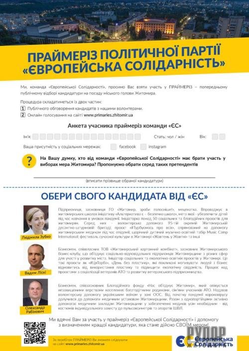 З 7 по 14 вересня житомирська міська організація партії «Європейська Солідарність» провела праймеріз кандидатів на посаду міського голови Житомира.