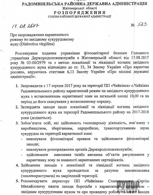 При проведенні обстежень посіві кукурудзи в ПП “Чайківка” с.Чайківка Радомишльського району на площі 10 га виявлено карантинний організм Західний кукурудзяний жук (Diabrotica virgifera). Згідно ст.33, 34 Закону України “Про карантин рослин” запроваджено карантинний режим.