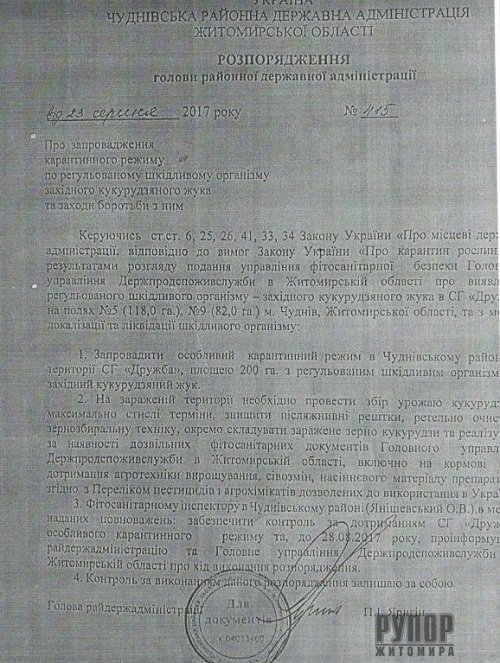 При проведенні обстежень посівів кукурудзи в СГ “Дружба ” на площі 200 га виявлено карантинний організм Західний кукурудзяний жук (Diabrotica virgifera). Згідно ст.33, 34 Закону України “Про карантин рослин” на території запроваджено карантинний режим.