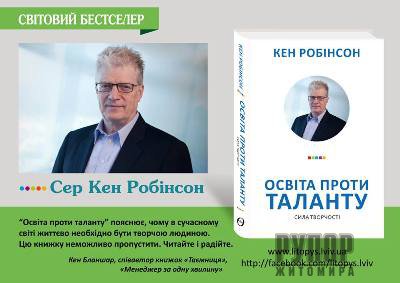 За підтримки депутата обласної ради Олени Галагузи у Житомирі відбудеться презентація книги Кена Робінсона «Освіта проти таланту. Сила творчості». Кен Робінсон – це відомий у всьому світі експерт і публічний спікер з питань освіти, творчого мислення та інновацій, чий виступ на конференції TED має понад п’ятдесят мільйонів переглядів. «Освіта проти таланту. Сила творчості» – друга книжка Кена Робінсона, яка вийшла українською мовою. На її сторінках автор розповідає про творчість та її значення у нашому житті. Робінсон захопливо й доступно описує, як інтелект і креативність працюють на біологічному рівні, й аргументує, чому творчість треба повернути не лише до шкільних класів, а й до організацій. Презентація книжки відбудеться 15 листопада о 14.30 год. в актовій залі гуманітарної гімназії № 23 (вул. Лятошинського, 14).