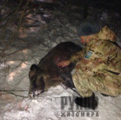 Так, 23 січня поточного року у вечірній час під час здійснення рейдових заходів на території Коростишівського району із залученням єгерського складу Коростишівського РО УТМР та ГО «Мисливське товариство «Козіївка» поблизу с. Козіївка було виявлено групу осіб, які проводили полювання на дикого кабана у заборонений час та без відповідних дозвільних документів. В результаті вжитих заходів, одного з них було затримано з добутою самкою дикого кабана. Державними інспекторами з охорони навколишнього природного середовища Житомирської області на правопорушника складено протокол про адміністративне правопорушення.
