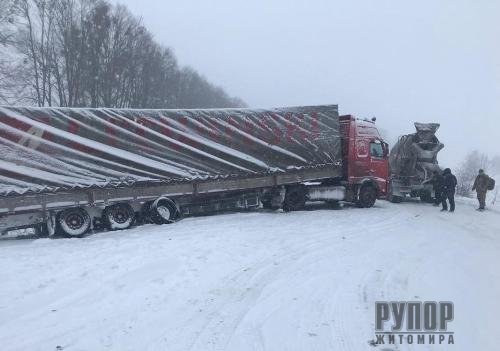 Близько 17 години в Андрушівському районі сталась пригода, що тимчасово обмежила рух транспорту автодорогою Андрушівка – Івниця. При зустрічному роз’їзді двох габаритних вантажівок причеп однієї з них занесло – і фура «склалась навпіл», перегородивши дорогу.