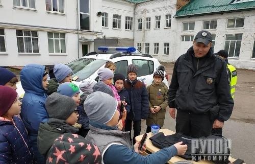 Зустріч правоохоронців зі школярами відбулася у дворі загальноосвітньої школі № 36 імені Я.Домбровського м. Житомира. На незвичайний урок завітали учні шести молодших класів, з якими поліцейські охорони та ювенальної превенції області провели пізнавальну бесіду та практичні заняття з правил безпечної поведінки.