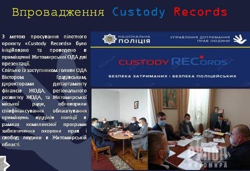 Нині у підрозділах поліції Житомирщини ведеться підготовка до впровадження системи Custody Records, яка дозволяє забезпечити належне поводження із затриманими особами, захистити поліцейських від неправдивих обвинувачень та зменшити корупційні ризики. Комплексне функціонування цієї системи унеможливлює навмисне чи випадкове порушення поліцейським процедури затримання громадян чи тримання їх у відділі поліції або ізоляторі тимчасового тримання.