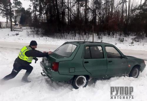 Вже упродовж кількох днів на Житомирщині спостерігається різка зміна погодних умов: сильний сніг, хуртовини, морози. Усе це, як наслідок, спричинило ускладнення руху транспортних засобів. Водночас поліцейські не залишилися байдужими та допомагають громадянам, які потрапили у снігові пастки.