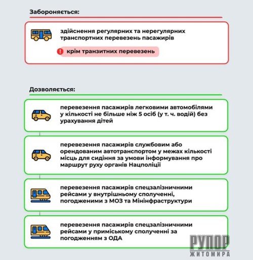 Нові обмеження стосуються роботи громадського транспорту. Забороняється здійснення регулярних та нерегулярних транспортних перевезень пасажирів (крім транзитних перевезень). Водночас під обмеження не потрапляють перевезення пасажирів легковими автомобілями у кількості 5 осіб (у т. ч. водій), але без урахування дітей; перевезення пасажирів службовим або орендованим автотранспортом у межах кількості місць для сидіння та за умови інформування Нацполіції; перевезення пасажирів спеціальними залізничними рейсами у внутрішньому сполученні, погодженими з Міністерством охорони здоров’я та Міністерством інфраструктури; перевезення пасажирів спеціальними залізничними рейсами в приміському сполученні за погодженням з ОДА. Зокрема, забороняється:– робота закладів громадського харчування, окрім адресної доставки та замовлень навинос; – робота ТРЦ та інших розважальних закладів, кінотеатрів, театрів; – робота закладів освіти, окрім дитячих садків і початкових класів шкіл; – робота непродовольчих ринків і магазинів, спортзалів, басейнів і фітнес-центрів; – проведення масових заходів, окрім офіційних спортивних заходів і матчів командних ігрових видів спорту без глядачів; – робота закладів культури, окрім історико-культурних заповідників, проведення кіно- та відеозйомки. Працюватимуть банки, АЗС, ветеринарні магазини, аптеки, всі продовольчі магазини.